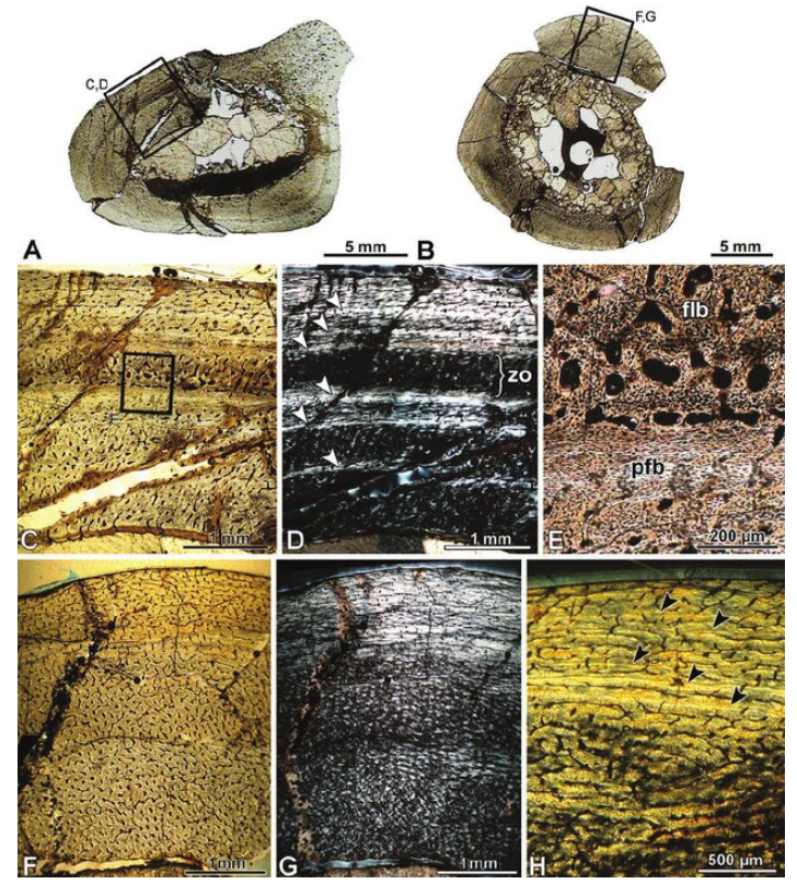 뼈의 성장 띠와 조직 분석을 통해 성장 주기, 성체 도달 시기, 생존 전략 등 다양한 생물학 정보를 제공한 사례입니다.
