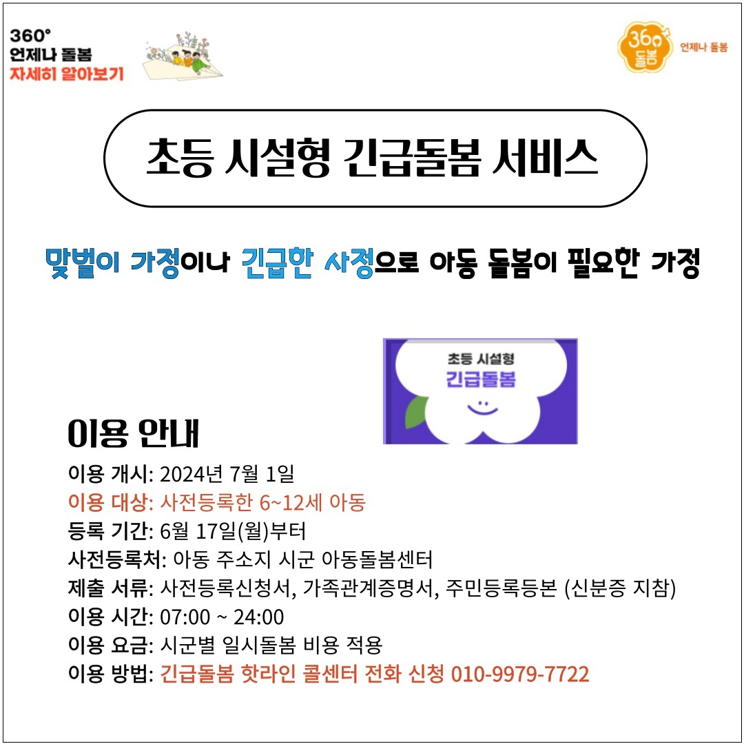 2024년 7월 1일부터 돌봄이 필요한 아동(6~12세)의 거주 시군 근처 다함께돌봄센터, 지역아동센터 등 아동돌봄 시설에서 평일 야간과 주말 및 휴일에 돌봄을 제공합니다. 이 서비스는 맞벌이 가정이나 긴급한 사정으로 아동 돌봄이 필요한 가정을 위한 것입니다.
