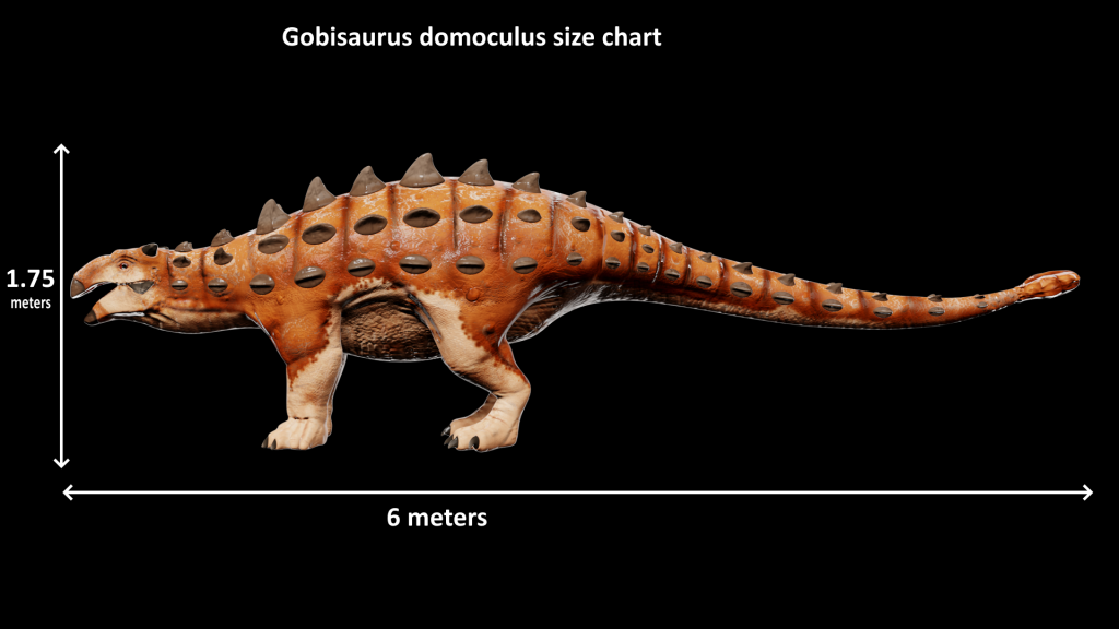 고비사우루스는 전신이 두꺼운 골질 갑옷과 피부 뼈로 덮여 있었던 방어형 공룡입니다. 약 6~7m에 이르는 몸길이와 4톤에 가까운 무게를 지녔으며, 낮은 몸체와 짧은 다리로 천천히 움직이는 대신, 외부 위협에 압도적인 수비력을 갖추고 있었습니다.