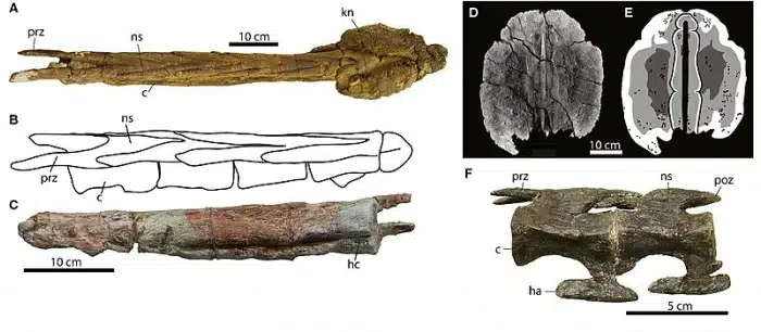 - C: 측면에서 본 두개골로, 두꺼운 신경돌기(ns)와 큰 후두돌기(hc)가 보임