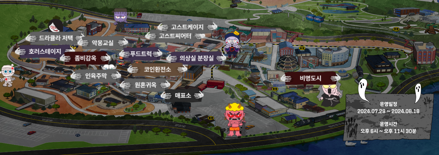 - 서브 어트랙션: 악몽교실, 고스트케이지, 원혼귀옥, 고스트씨어터, 인육주막, 드라큘라 저택