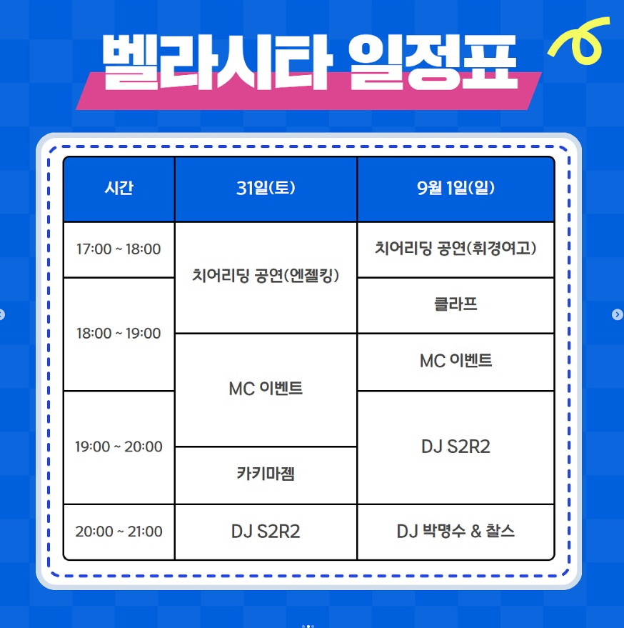| 8월 31(토) | 17:00 ~ 18:30 | 치어리딩 공연 (가톨릭대학교, 용인대학교, 서율여자대학교, 경기대학교, 엔젤킹) |