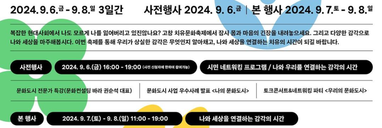 고창 치유문화축제는 현대사회에서 잃어버린 감각을 되찾고 나와 세상을 연결하는 시간을 제공합니다. 이 축제는 몸과 마음의 긴장을 풀고, 다양한 감각을 통해 자신과 주변을 새롭게 마주하는 치유의 장이 될 것입니다.