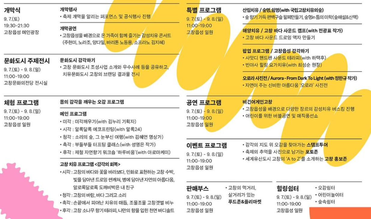 | 특별 프로그램 | 산림치유 / 숲멍, 쉼영 (with 국립고창치유의숲) - 숲 향기 가득 편백나무숲 팔찌 만들기, 숲음악듣기 (with 송혜선 소장) 해양치유 / 고창 바다 사운드 캠프 (with 전광표 작가) - 고창 바다 사운드 드로잉 액자 만들기 팝업 프로그램 / 고창읍성 감각하기 - 사악의 핸드팬 사운드 테라피 (with 하태욱) - 반야힐링 요가치유 (with 최성순 원장) 오로라 사진전 / Aurora - From Dark To Light (with 정한구 작가) - 자연이 주는 신비한 아름다움 '오로라' 사진전 |