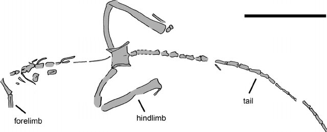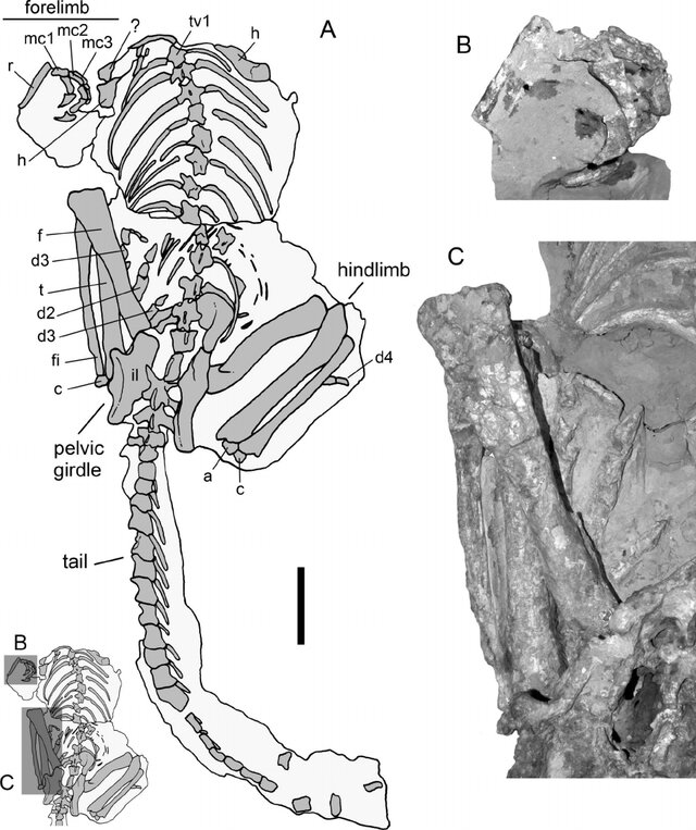 발굴된 화석은 두개골을 포함하지 않지만, 척추, 골반, 앞다리, 뒷다리 등 대부분의 신체 구조가 보존되어 있으며, 행동학적 해석이 가능한 자세 그대로의 표본도 존재합니다.