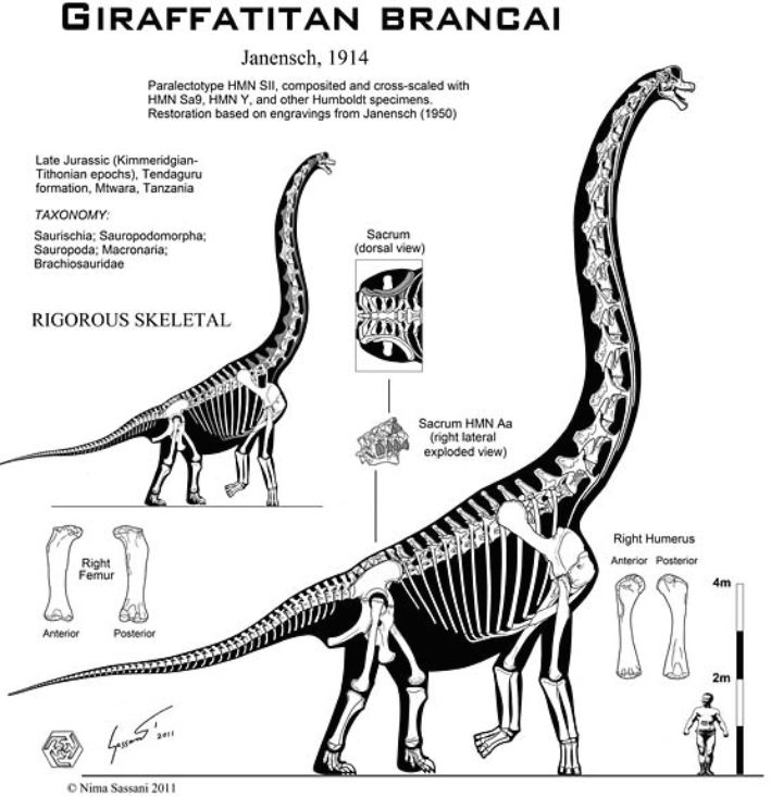 - 복원 기준: 다양한 개체 화석(HMN SII, Sa9, Y 등)을 조합하여 복원. Janensch의 1950년 삽화를 바탕으로 재구성.
