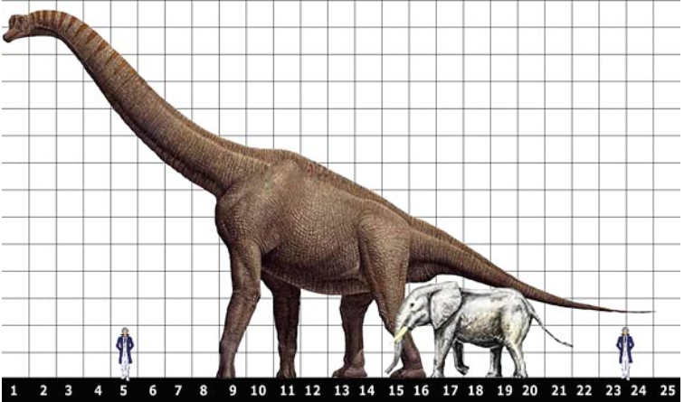 A2. 길이 약 23m, 어깨 높이 약 6m, 무게는 30~40톤에 달했을 것으로 추정됩니다.