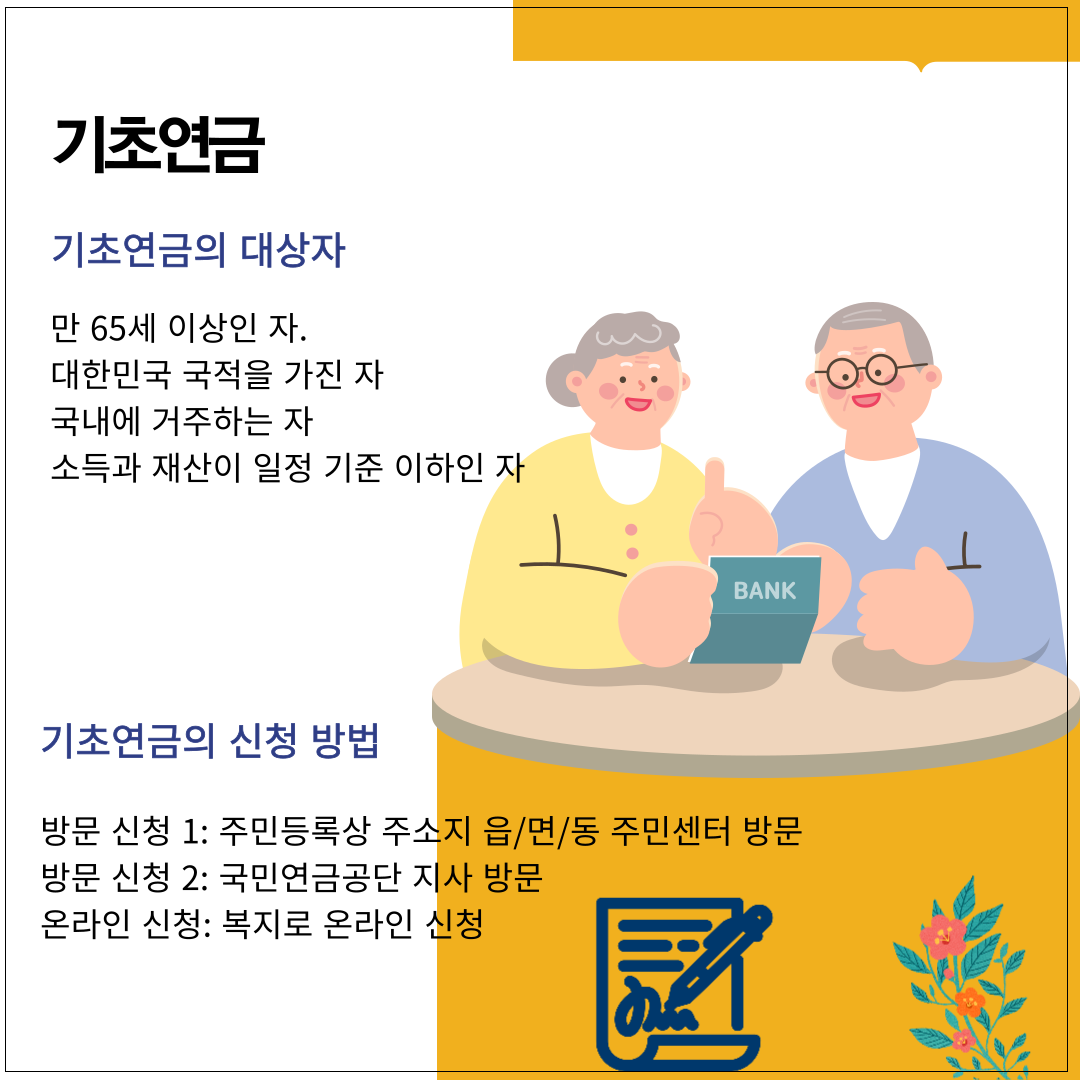 기초연금을 받기 위해서는 신청자가 직접 신청 혹은 대리인 신청이 가능하며, 신청 방법은 다음과 같습니다.