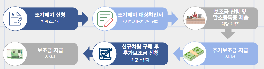 노후 경유차를 조기폐차하고 보조금을 받기 위한 절차는 아래와 같습니다. 이 과정을 통해 차량 소유자는 보조금을 수령하고, 신규차량 구매 시 추가 보조금을 신청할 수 있습니다.