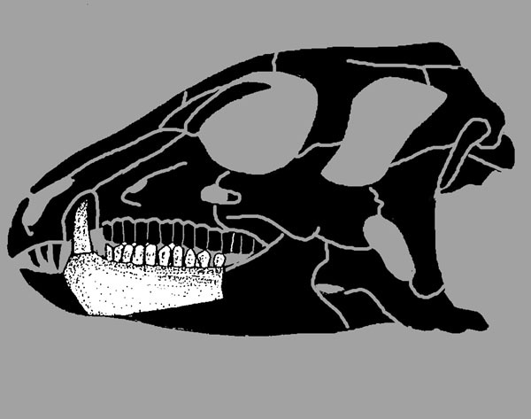 앞니는 뾰족하고 송곳니처럼 날카롭지만, 어금니에 해당하는 뒷이빨은 식물 섭취에 적합한 톱니 모양으로, 이는 잡식성 가능성 또는 방어적 역할을 위한 진화로 해석되기도 합니다. 두개골은 비교적 가늘고 길며, 턱에는 치열한 운동을 가능케 하는 관절 구조가 있었습니다.