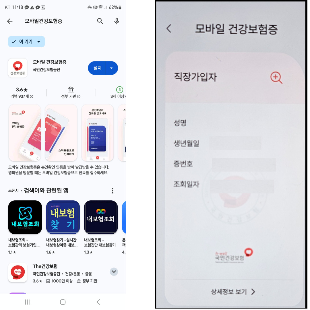 - 앱 설치: Play스토어나 App스토어에서 ‘모바일 건강보험증’을 검색하여 스마트폰에 설치합니다.