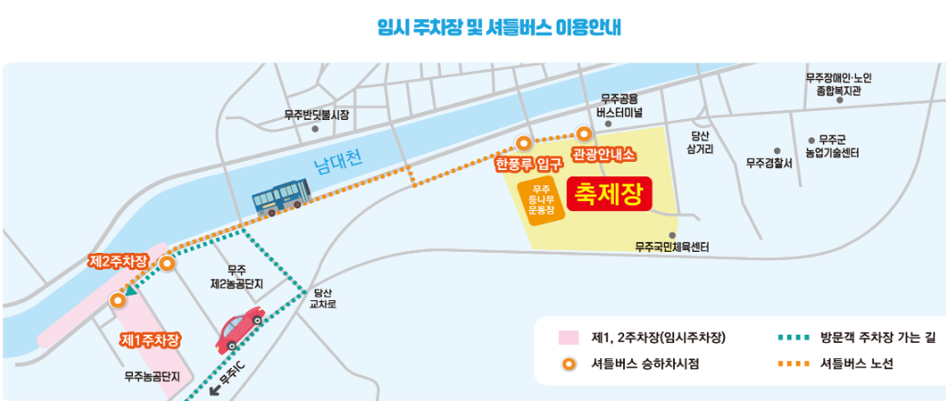 주차장: 전북 무주군 무주읍 당산리 1723 / 당산강변로 32 (주차 후 셔틀버스로 행사장으로 이동)