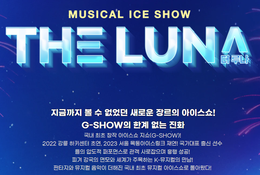 G-SHOW: THE LUNA는 뮤지컬과 아이스쇼의 경계를 허물며 새로운 예술적 경험을 선사하는 국내 최초의 뮤지컬 아이스쇼입니다. 2022년과 2023년에 이어 2024년에는 더욱 강력한 퍼포먼스와 미디어 아트가 결합되어, 관객들에게 판타지 세계로의 여정을 선사합니다.