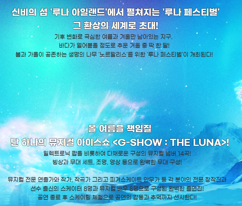 이번 여름, G-SHOW: THE LUNA와 함께 여러분의 감각을 깨워보세요. 아름다운 판타지와 화려한 퍼포먼스가 어우러진 이 공연은 잊을 수 없는 추억을 선사할 것입니다. 뮤지컬과 아이스쇼의 완벽한 조화를 통해, 뜨거운 여름을 시원하게 즐겨보세요.