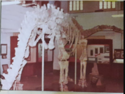 이미지는 인도의 고생물학 박물관에 전시된 바라파사우루스(Barapasaurus)의 골격 복원 전시물을 촬영한 것입니다. 바라파사우루스는 쥐라기 초기의 대표적인 대형 초식 공룡으로, 인도 고다바리 분지에서 출토된 수백 개체의 화석 중 하나를 기반으로 구성되었습니다. 해당 전시물은 뼈의 실루엣과 배열을 바탕으로 전체적인 신체 비율과 자세한 골격 구조를 시각적으로 재현하였으며, 견고한 지지대를 통해 서 있는 자세를 유지하고 있습니다. 이와 같은 전시물은 용각류의 진화적 특성과 해부학적 특징을 보여 줍니다.