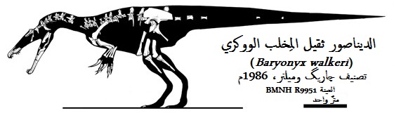 이미지는 바리오닉스 워커리(Baryonyx walkeri)의 골격 복원도이며, 아랍어로 해설된 버전입니다. 해당 그림은 원래 미국의 고생물 일러스트레이터 Jaime A. Headden가 제작한 것으로, BMNH R9951라는 런던 자연사박물관 소장 표본을 바탕으로 구성된 과학적 복원 스케치입니다. 이후 이를 아랍어로 번역한 것은 사용자 باسم (Basem)입니다. 실제 화석으로부터 복원한 형태로, 하얀색은 실제 발견된 부위, 검은색은 미발견 상태에서 추정 복원된 부위입니다.