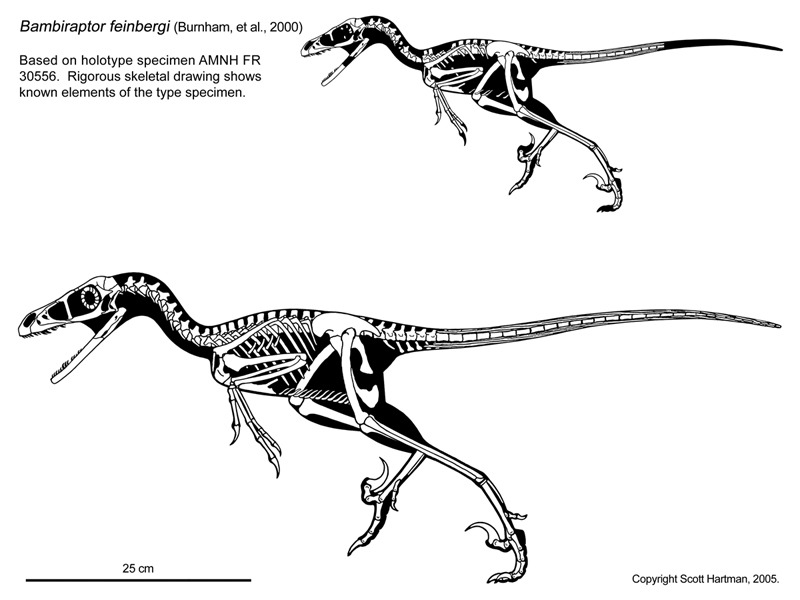 이미지는 밤비랩터(Bambiraptor feinbergi)의 골격 복원도를 보여주고 있습니다. 상단과 하단의 두 그림은 동일한 개체(AMNH FR 30556, 정식 표본)를 기준으로 각기 다른 시점에서 그린 골격도로, 흰색 부분은 실제로 발견된 뼈를 나타내며, 검은색은 해부학적 유추를 통해 보완된 부분을 의미합니다.
