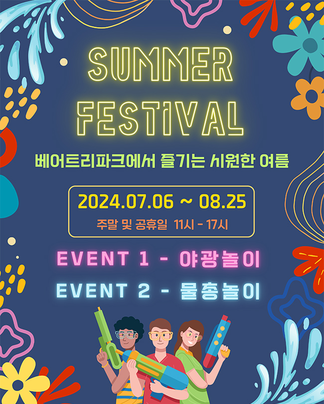 베어트리파크 SUMMER FESTIVAL은 여름철 시원한 야외 활동을 즐길 수 있는 다양한 프로그램을 제공합니다. 야광놀이와 물총놀이가 주요 프로그램으로, 가족 모두가 함께 즐길 수 있는 활동이 준비되어 있습니다.