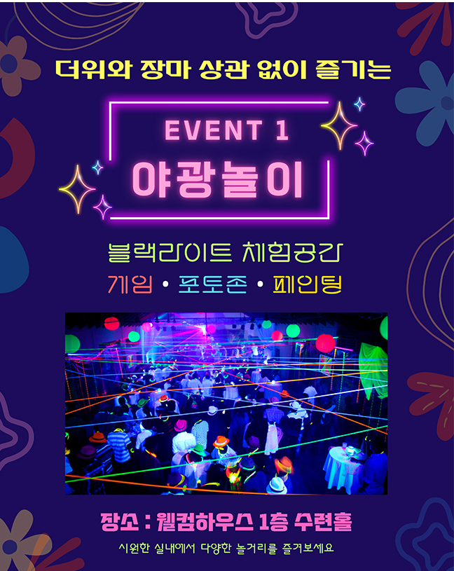 - 야광놀이: 블랙라이트 룸에서 다양한 포토존과 게임을 즐길 수 있습니다. 바디 페인팅으로 색다른 경험을 하며 인생샷을 남겨보세요.