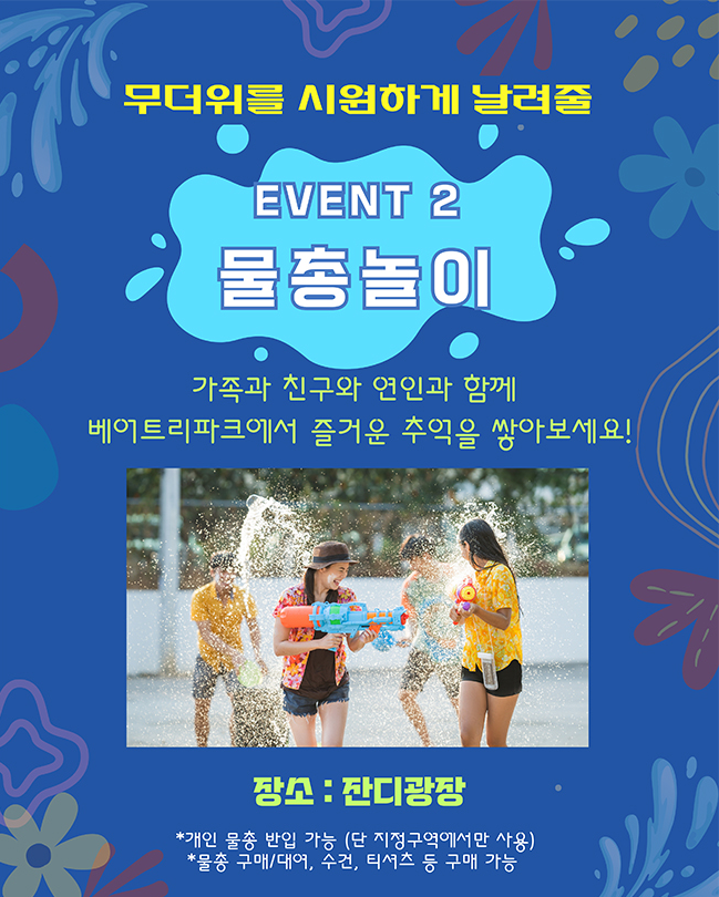 - 물총놀이: 넓은 잔디광장에서 시원하게 물총놀이를 즐길 수 있습니다. 친구, 가족들과 함께 물총으로 더위를 날려버리세요.