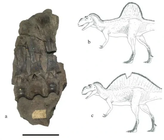 그림은 고생물학자 Darren Naish가 제안한 Becklespinax의 외형 복원 두 가지 가능성을 보여줍니다. 상단 복원도(b)는 척추 신경돌기가 척추 전반에 걸쳐 이어지며 긴 돛(sail)을 형성한 형태이고, 하단 복원도(c)는 짧고 국소적인 융기 형태로 복원한 예입니다. 신경돌기의 길이 차이와 형상이 뚜렷하게 드러나 있으며, 앞쪽 돌기는 유독 짧아 병변(pathology)이거나 돛의 시작부일 가능성이 제기됩니다.
