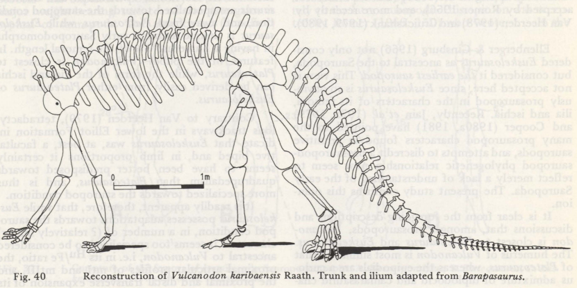 그림 40번은 Vulcanodon karibaensis의 복원도입니다. 이 복원도는 트렁크(몸통)와 장골(ilium)을 Barapasaurus의 형태를 참고하여 재구성한 것입니다. 그림의 핵심 목적은 초기 용각류가 어떤 체형을 가졌는지를 시각적으로 보여주는 데 있으며, 특히 사지 비율과 전체적인 외형이 후기 거대 용각류로 진화하는 과정을 암시합니다.