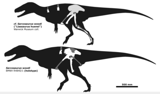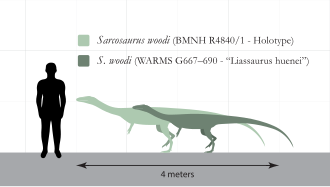 그림은 사르코사우루스(Sarcosaurus woodi)의 알려진 화석 부위를 중심으로 한 두 가지 개체의 복원도를 비교한 것입니다. 상단은 cf. Sarcosaurus woodi ("Liassaurus huenei")로 추정되는 개체이며, 하단은 공식적으로 명명된 홀로타입(BMNH R4840/1)입니다.