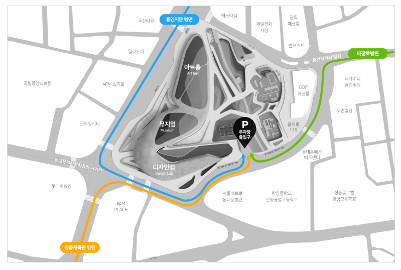 DDP 주차장 이용 가능, 현장 안내에 따라 주차 가능.
