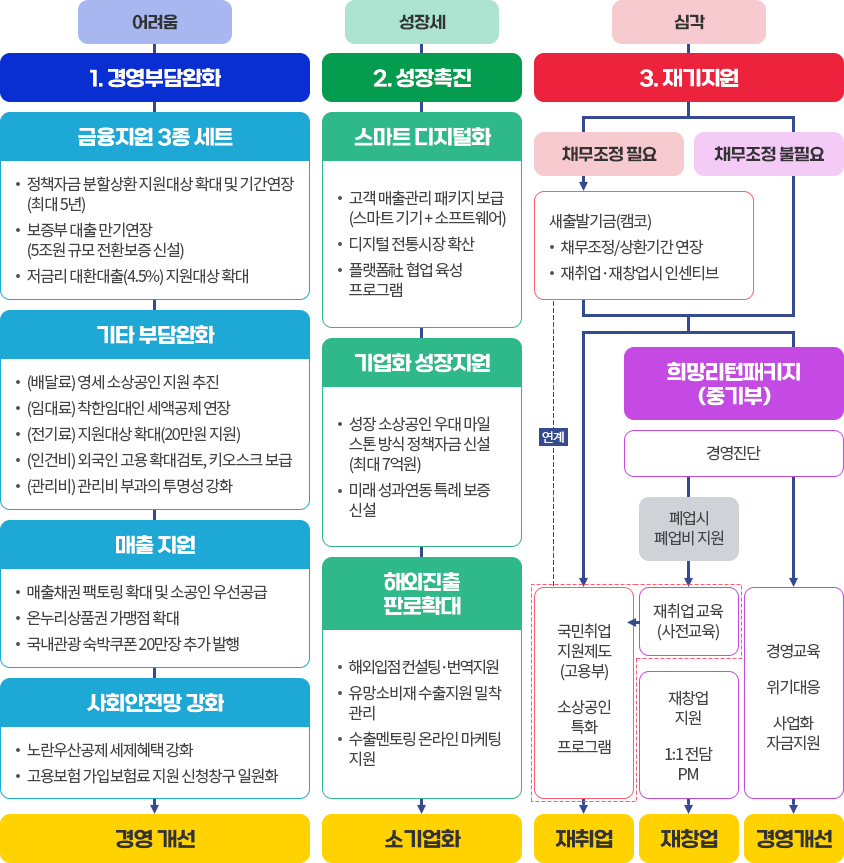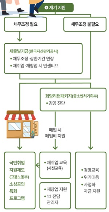 정부는 소상공인의 채무조정 대상과 신청기한을 연장하고, 취업 및 재창업을 희망하는 이들을 위한 ‘새출발 희망 프로젝트’를 새로 선보입니다. 이를 통해 소상공인이 실패 후 재기를 준비할 수 있도록 돕고, 일대일 밀착 관리를 통해 재창업을 지원합니다.