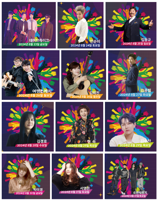 - 릴레이 공연에서는 다양한 뮤지션과 버스커들이 참여하며, 데이브레이크, 인순이, 김동규, 여행스케치 등 유명 아티스트들의 무대도 준비되어 있습니다.