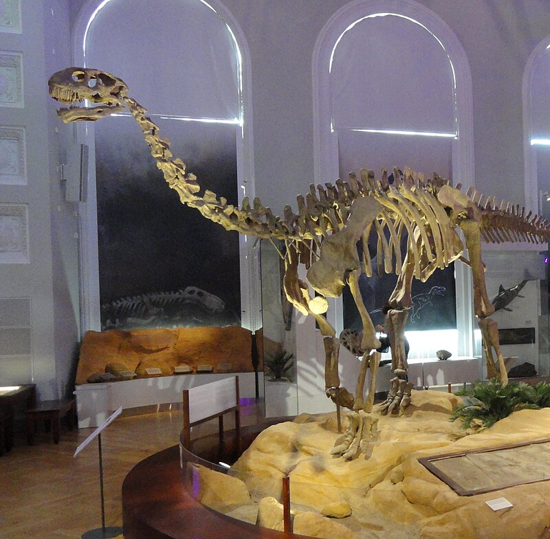 이미지는 핀란드 헬싱키 자연사박물관(Finnish Museum of Natural History)에 전시된 슈노사우루스(Shunosaurus lii)의 전신 골격 복원물입니다. 약 1억 6천만 년 전 쥐라기 중기에 중국 쓰촨성에서 서식했던 중형 용각류로, 이 전시물은 슈노사우루스의 짧은 목, 굵은 몸통, 그리고 네발 보행 형태를 명확히 보여줍니다.