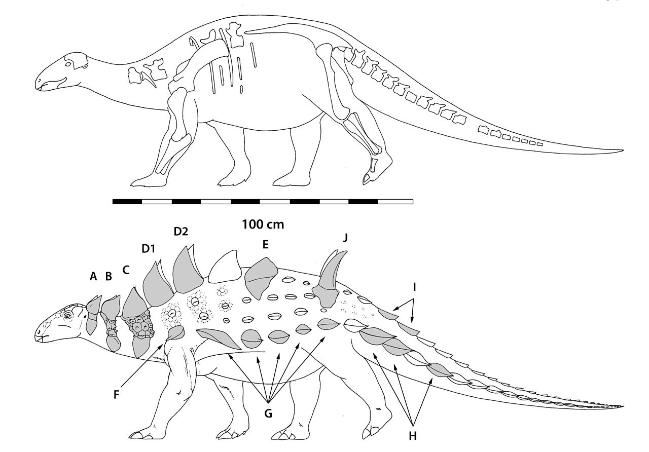 하단 그림은 상상 복원도입니다. 목과 등 중앙에 커다란 방어용 골판 및 가시가 배열되어 있으며, 몸 측면과 꼬리에도 크고 작은 피부 골편(오스테오덤)이 밀집해 있는 모습입니다. 특히 양 어깨 부근과 꼬리 뿌리에 강화된 스파이크 형태의 갑옷이 배열되어 육식공룡의 공격으로부터 몸을 보호하는 기능을 했을 것으로 보입니다.
