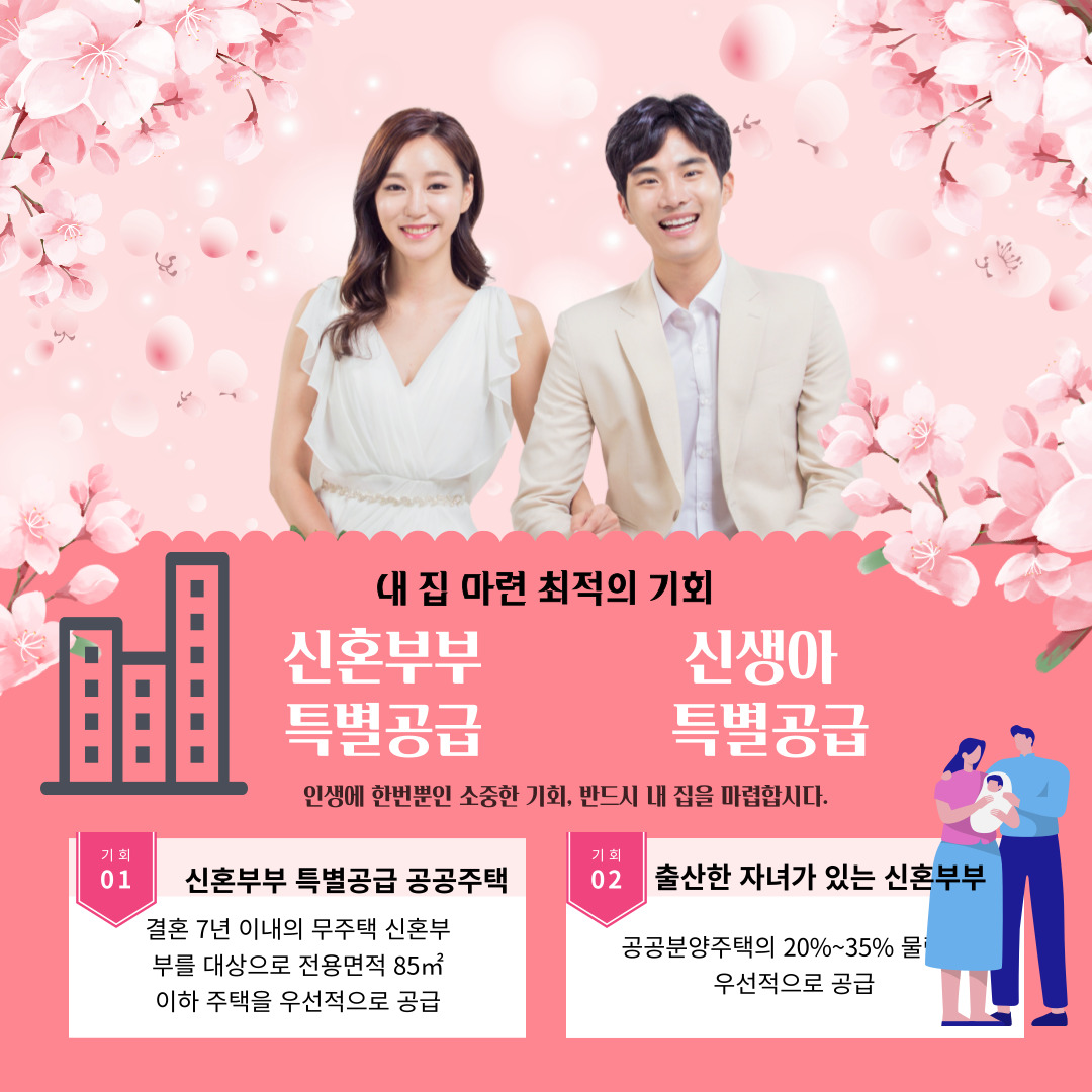 신혼부부 특별공급과 신생아 특별공급의 개념 및 변화된 내용을 중심으로 설명하였습니다. 이 둘의 조건과 혜택을 자세히 알아 보려면 주제가 방대하므로, 두 개의 블로그로 나누어 작성하였습니다. 첫 번째 블로그는 신혼부부 특별공급에 중점을 두고, 두 번째 블로그는 신생아 특별공급과 신혼부부 특별공급의 최근 개편사항에 초점을 맞추어 작성합니다.