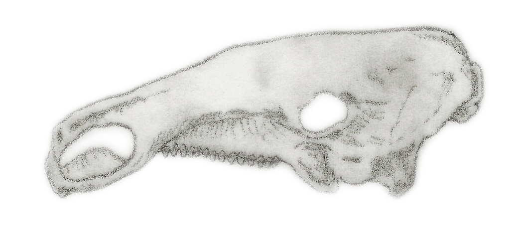 이미지는 실비사우루스(Silvisaurus condrayi)의 두개골 복원도입니다. 측면에서 본 이 두개골 스케치는 노도사우루스과 공룡의 전형적인 머리 구조를 보여주며, 낮은 전두부, 뚜렷한 눈구멍, 그리고 부리 형태의 앞턱이 뚜렷하게 표현되어 있습니다.