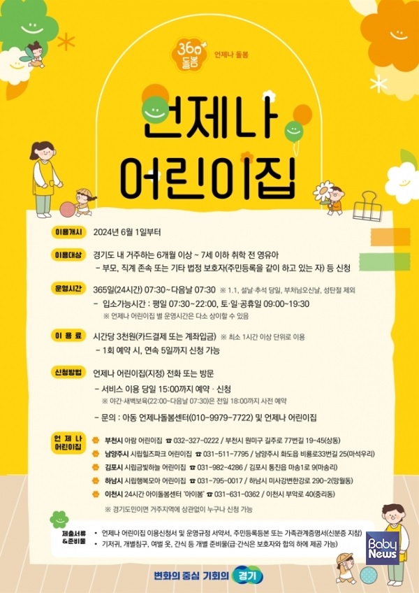 경기도에서는 영유아를 둔 부모(양육자)를 위해 긴급 또는 일시적인 돌봄이 필요할 때 언제든지 믿고 맡길 수 있는 안전한 돌봄 서비스를 제공하는 360° 돌봄 '언제나 어린이집'을 운영합니다.