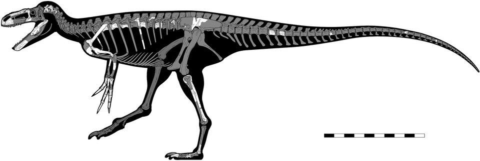 이미지는 에오티라누스 렝기(Eotyrannus lengi)의 전체 골격을 복원한 과학적 재구성도로, 알려진 화석 부위(흰색)와 타 티라노사우루스과 공룡의 비교를 바탕으로 추정된 해부 구조(회색 부분)를 함께 표시하고 있습니다. 복원은 고생물 일러스트레이터 Dan Folkes가 제작하였으며, Darren Naish와 Andrea Cau의 연구에 기반하여 2022년에 발표되었습니다.
