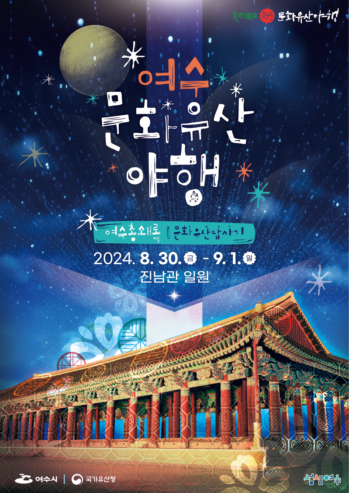2024 여수 문화유산야행은 여수의 역사와 문화를 조명하는 대표적인 야간관광 축제입니다. 이번 축제는 2024년 8월 30일(금)부터 9월 1일(일)까지 여수 진남관 일원에서 3일간 진행됩니다. 7夜의 다양한 프로그램이 마련되어 있으며, 여수의 풍부한 문화유산을 밤하늘 아래에서 체험할 수 있는 기회가 제공됩니다.