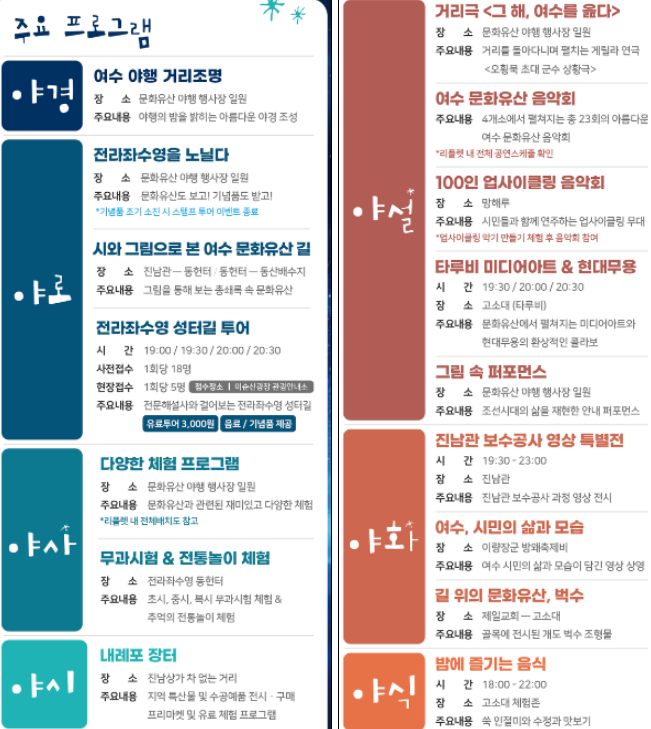 | 야설 | 거리극 <그 해, 여수를 읊다> 장소: 문화유산 야행 행사장 일원 주요내용: 거리극을 돌아다니며 펼쳐지는 게릴라 연극 여수 문화유산 음악회 장소: 4개소 주요내용: 4개소에서 펼쳐지는 총 23회의 아름다운 여수 문화유산 음악회 *리플렛 내 전체 공연세부표 참조 100인 업사이클링 음악회 장소: 망해루 주요내용: 시민들과 함께 연주하는 업사이클링 무대 *업사이클링 악기 만들기 체험 후 음악회 참여 타루비 미디어아트 & 현대무용 장소: 스탬프 (타루비) 주요내용: 문화유산에서 펼쳐지는 미디어아트와 현대무용의 환상적인 콜라보 |