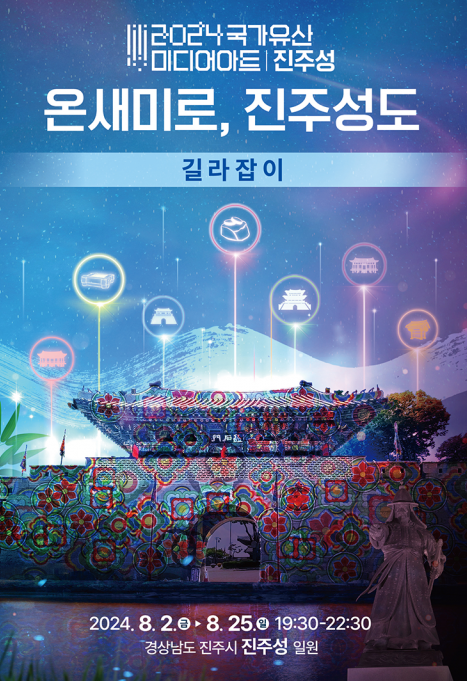 안녕하세요, 오늘은 경남 진주시에서 열리고 있는 2024 국가유산 미디어아트 진주성에 대해 소개해드리려고 합니다. 이번 행사는 2024년 8월 2일부터 8월 25일까지 24일간 펼쳐지며, ‘온새미로 진주성도’라는 주제로 진행됩니다. ‘온새미로’는 가르거나 쪼개지 않은, 있는 그대로의 상태를 뜻하는 순우리말로, 진주성의 역사와 변천사를 원형 그대로 보여주고자 하는 뜻을 담고 있습니다.