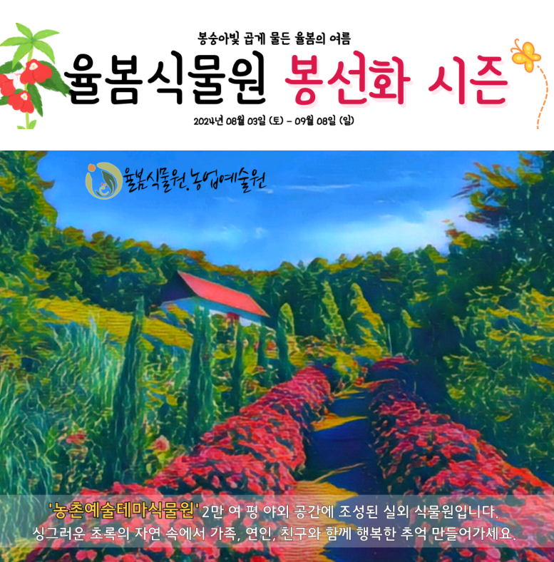 율봄식물원은 2만 여평의 야외 공간에 계절별로 피고 지는 다양한 꽃과 나무를 관람할 수 있는 실외 식물원으로, 곳곳에 마련된 벤치와 평상에서 초록의 청정 자연을 만끽하는 휴식을 즐길 수 있습니다. 봉선화 시즌을 맞아 율봄식물원을 방문해 여름과 가을의 정취를 느껴보세요.