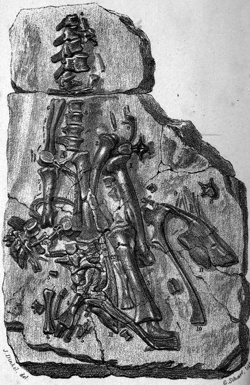 이미지는 1834년 영국 켄트주의 메이드스톤(Maidstone) 채석장에서 발견된 고대 공룡 화석을 묘사한 고전 석판화입니다. 이 화석은 초기 이구아노돈(Iguanodon) 표본 중 하나로 간주되며, 당시 고생물학자인 기드온 맨텔(Gideon Mantell)이 수집하여 연구에 활용하였습니다.
