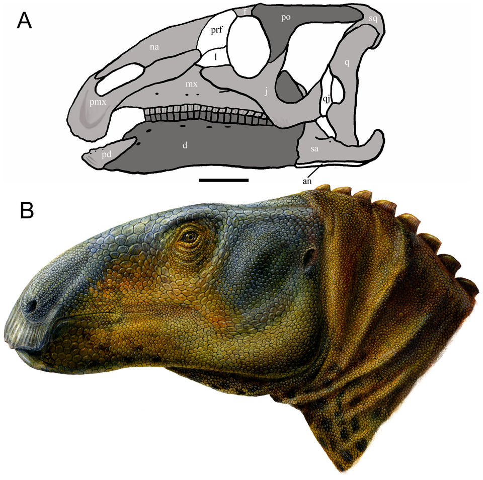 (B) 생전 머리 복원도: Lukas Panzarin이 제작한 이오람비아의 머리 복원 일러스트입니다. 비늘 형태의 피부 질감과 둥근 두개골, 두드러진 볏이 없는 구조가 특징으로, 하드로사우루스과 초기 공룡의 외형을 사실적으로 표현하였습니다. 짙은 눈과 짧은 주둥이는 특유의 순한 인상을 주며, 목덜미 부분의 돌기들은 생존을 위한 시각적 과시 또는 방어 기능을 암시합니다.