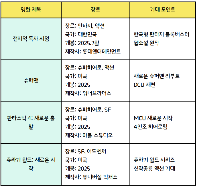 2025년 여름, 한국 영화계에 또 하나의 대형 블록버스터가 찾아옵니다. <전지적 독자 시점>은 방대한 원작의 세계관을 스크린에 담아내며, 한국형 판타지 액션 영화의 새로운 도전을 보여줄 예정입니다. 치열한 할리우드 블록버스터들과의 경쟁 속에서 어떤 성과를 거둘지 기대되며, 앞으로 공개될 추가 정보에도 많은 관심이 모아질 것으로 보입니다. 과연 이 영화가 올여름 극장가의 판도를 뒤흔들 수 있을지, 개봉일까지 기대감을 높여봅시다!
