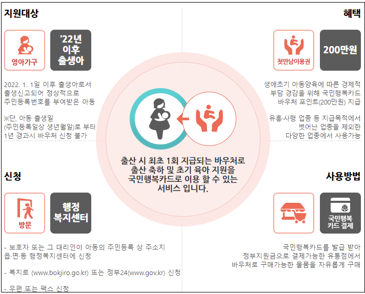 - 첫째아: 200만 원 (일시금) 바우처(국민행복카드)