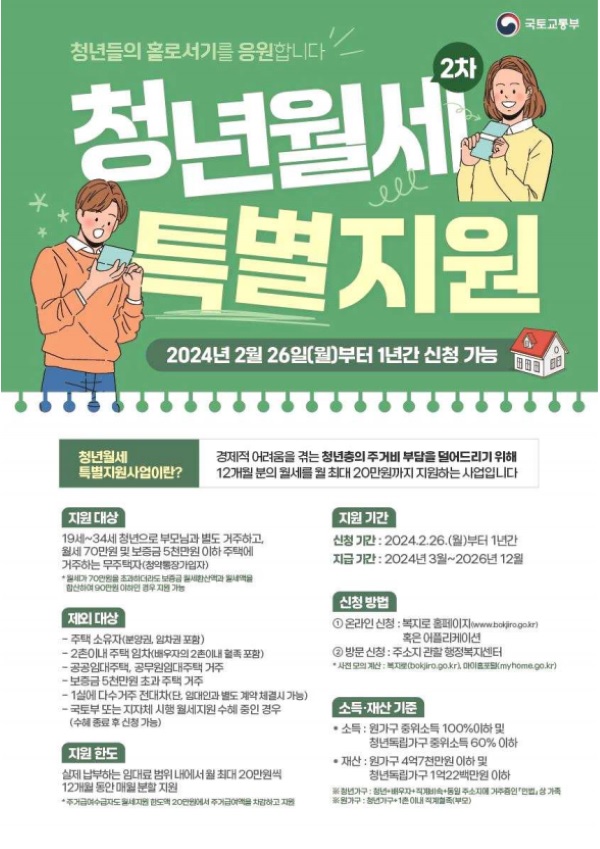 청년월세 한시 특별지원 사업은 국토교통부에서 고금리, 고물가 등으로 어려움을 겪는 청년층의 주거비 부담 경감을 위해 지원금을 지급하는 방식으로 월세로 거주하는 청년들을 한시적으로 지원해 주는 사업입니다.