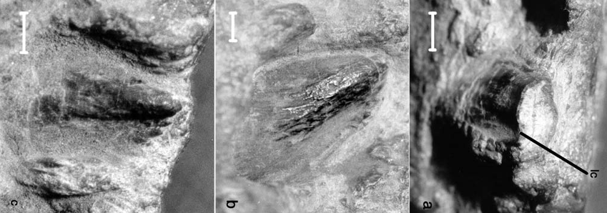 (b) 3번 이빨 – 혀쪽에서 본 모습으로, 주름진 에나멜층과 일부 톱니 구조(serrations)가 보임.