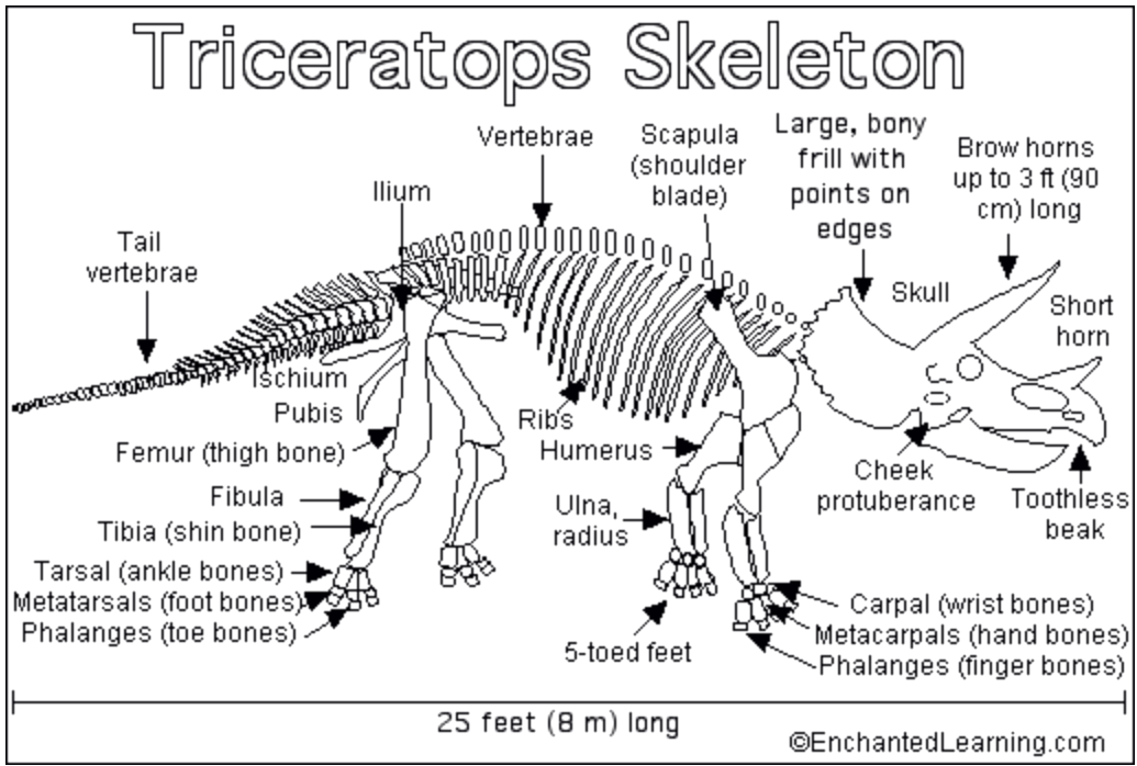 ※ Tail vertebrae(꼬리뼈), Ilium(장골), Ischium(궁둥뼈), Pubis(치골), Femur(대퇴골), Fibula(종아리뼈), Tibia(정강이뼈), Tarsal(발목뼈), Metatarsals(발허리뼈), Phalanges(발가락뼈), Vertebrae(척추뼈), Scapula(견갑골), Ribs(갈비뼈), Humerus(상완골), Ulna(척골), Radius(요골), Carpal(손목뼈), Metacarpals(손허리뼈), Phalanges(손가락뼈), 5-toed feet(다섯 발가락 발), Skull(두개골), Brow horns(눈 위 뿔), Short horn(짧은 뿔), Cheek protuberance(볼 돌기), Large frill(큰 프릴), Toothless beak(이빨 없는 부리).