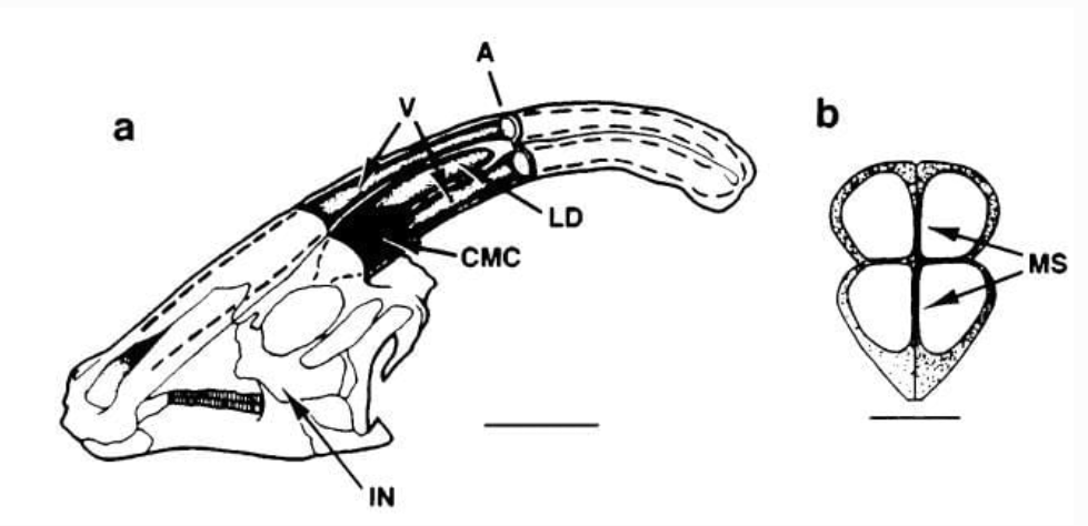 - 두개골과 볏의 단면: 볏 내부에 복잡한 기도 구조가 그려져 있으며, 소리의 공명을 가능하게 하는 길쭉한 관 형태임을 보여줍니다.