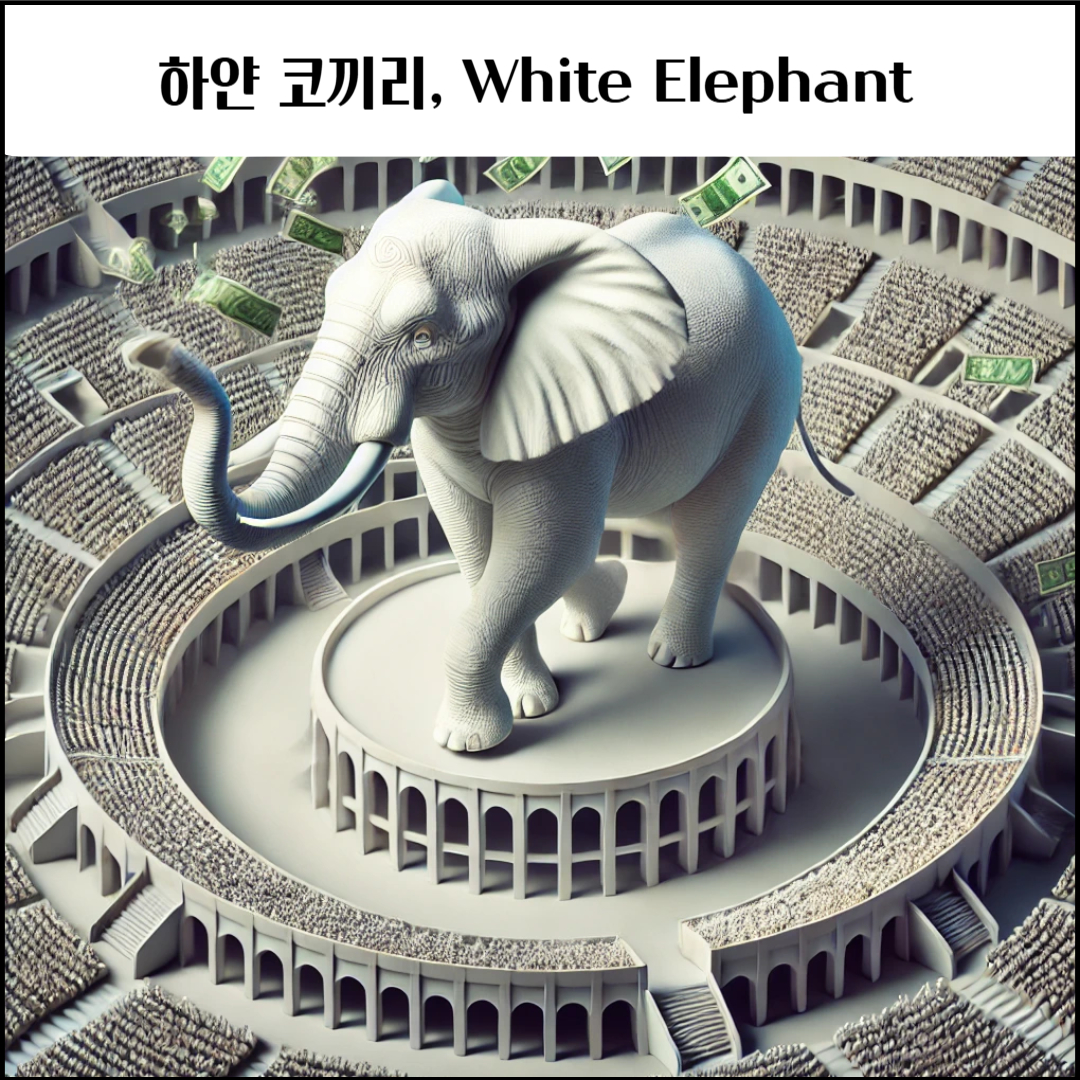 하얀 코끼리(White Elephant)는 유지비는 많이 드나 쓸모는 없는 사물이나 시설, 혹은 정책을 뜻합니다. 외형적으로는 거창하거나 특별해 보일 수 있지만, 실제로는 사용 가치가 낮고 부담만 큰 경우를 말하며, 낭비의 상징처럼 쓰입니다. 공공 프로젝트나 기업의 투자 사업에서 이 개념은 비효율성을 비판할 때 자주 등장합니다.