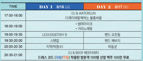 - 부대프로그램으로는 DJ와 함께하는 물총싸움, 애프터파티, 썸머마이크 거리 노래방 등이 있어 모든 연령대가 즐길 수 있는 다양한 활동이 마련되어 있습니다.
